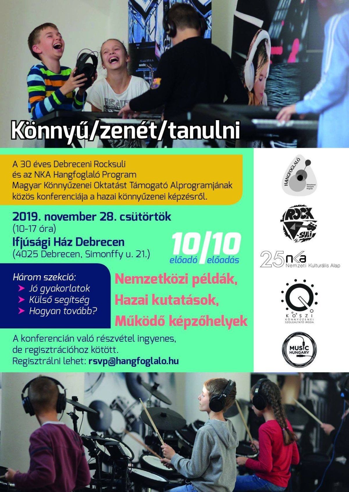 Könnyű/Zenét/Tanulni címmel közös konferenciát szervez az idén 30 éves Debreceni Rocksuli és az NKA Hangfoglaló Program Magyar Könnyűzenei Oktatást Támogató Alprogramja 2019. november 28-án a Debreceni Ifjúsági Házban.