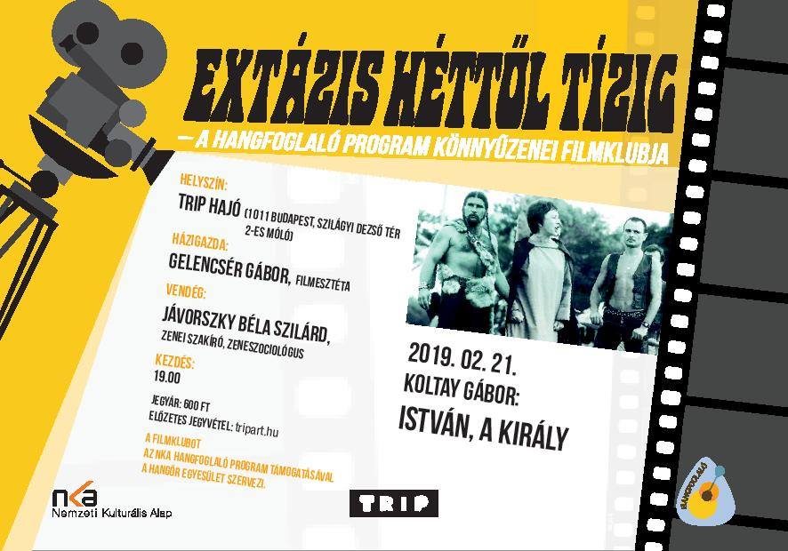 Az Extázis héttől tízig következő alkalmán, 2019. február 21-én Koltay Gábor - István, a király című filmjét tekinthetik meg az érdeklődök. A vetítés utáni beszélgetésen a filmklub házigazdájának, Gelencsér Gábornak a vendége Jávorszky Béla Szilárd, zenei szakíró, zeneszociológus lesz.