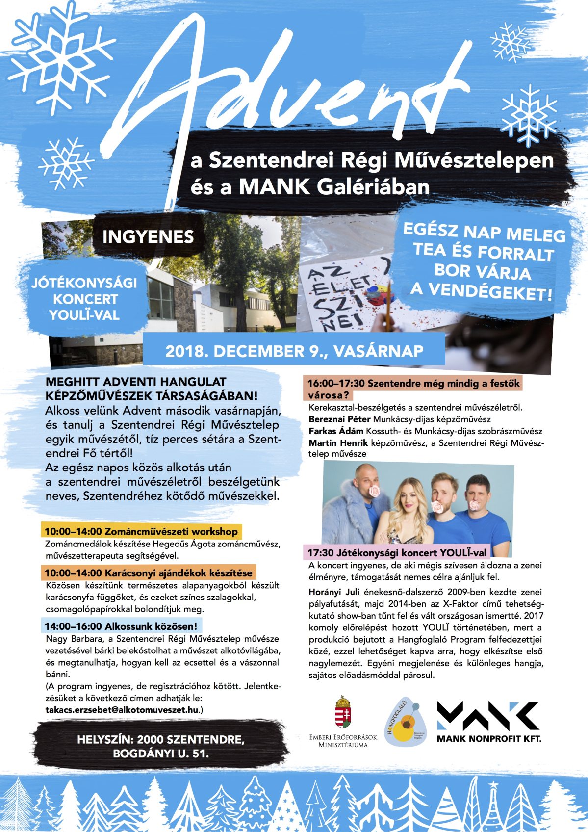Zománcművészeti workshop, karácsonyi ajándékkészítő foglalkozás és művészekkel közös alkotás lehetősége várja december 9-én a Szentendrei Régi Művésztelepre és a MANK Galériába látogatókat. A napot Horányi Juli YOULÏ jótékonysági koncertje zárja.