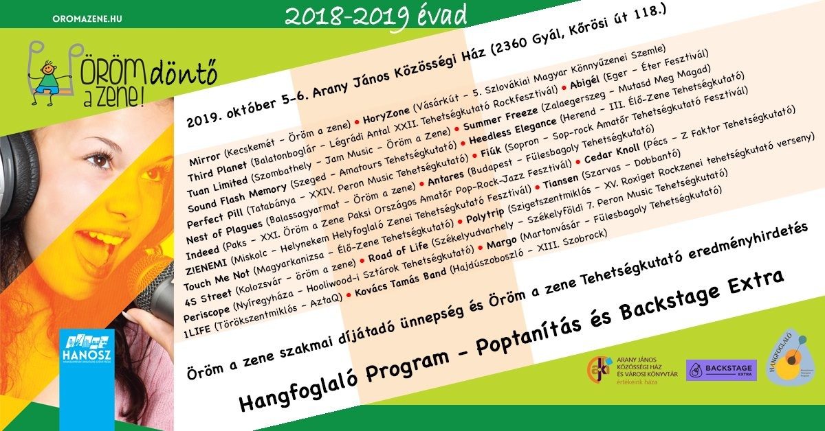 Október 5-6. kerül megrendezésre a 11. évadának végéhez érkező Öröm a zene Tehetségkutató és Gondozó Sorozat döntője (Arany János Közösségi Ház és Városi Könyvtár – 2360 Gyál, Kőrösi út 118-120.). A Hangszeresek Országos Szövetsége 2009 óta rendezi meg az Öröm a zene tehetségkutató sorozatot, amely mára – az NKA Hangfoglaló Program támogatásával – a Kárpát-Medence legnagyobb szakmai tehetségkutató sorozatává vált. A sorozatnak összesen 26 állomása van, amelyből 19 megyei és egy fővárosi, 5 határon túli (erdélyi, vajdasági és felvidéki) állomása és egy országos döntő eseménye van.